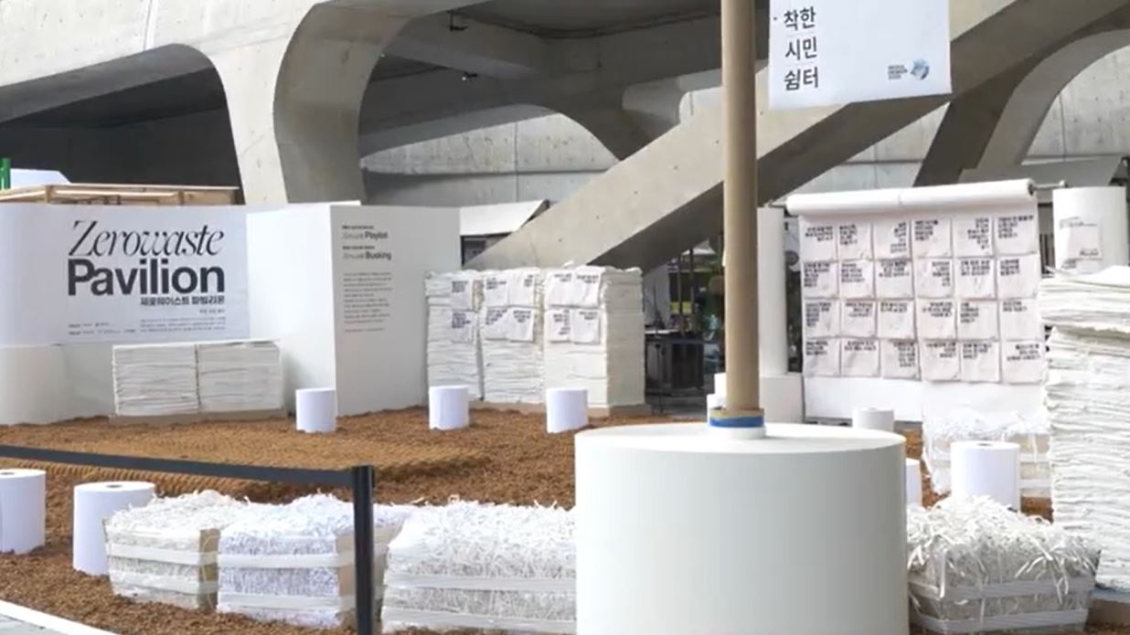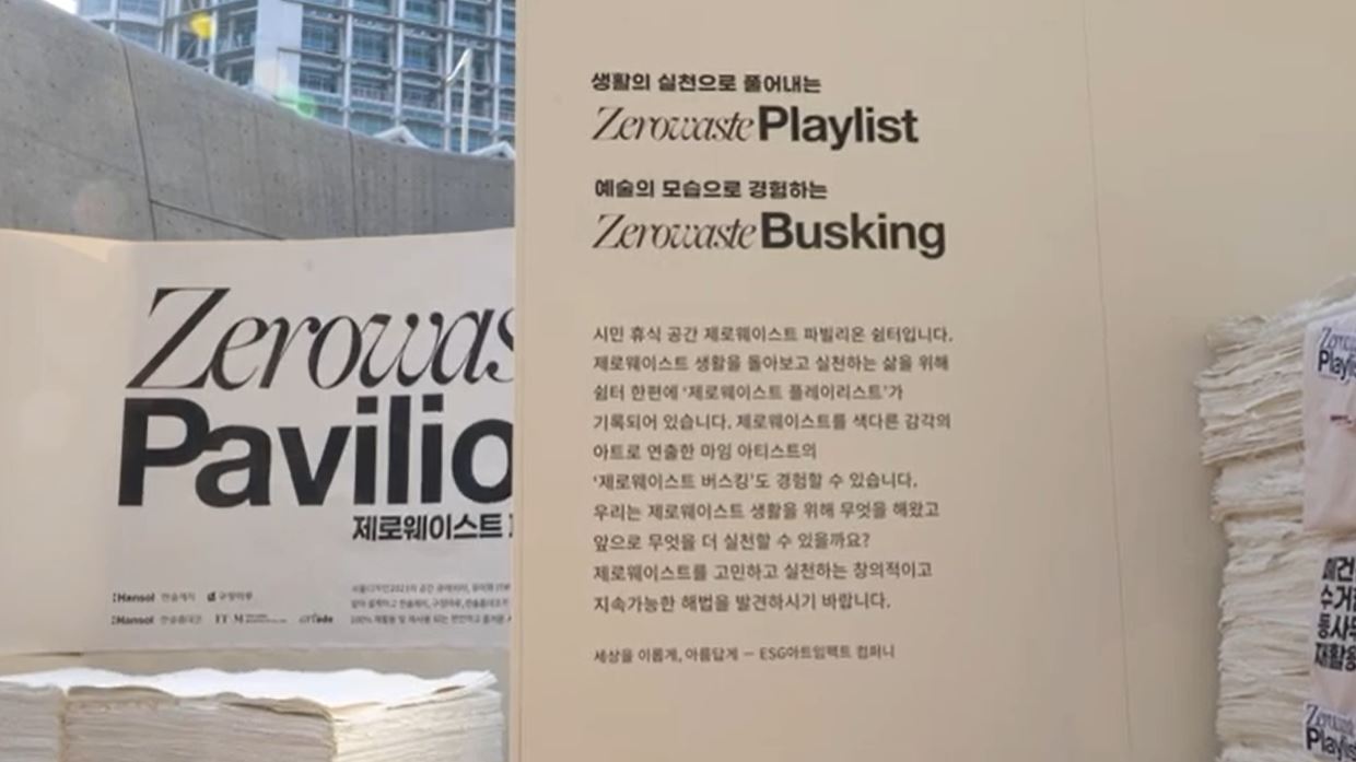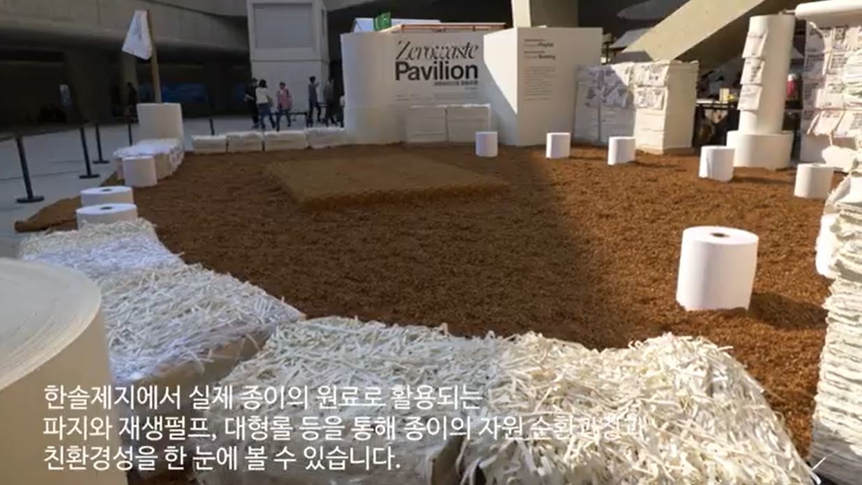 제로웨이스트 파빌리온은 한솔제지, 한솔홈데코, 구정마루가 협력하여 3사의 폐자재를 활용하고 전시 후에도 전시되었던 모든 소재가 다시 재활용되어 폐기물이 남지 않는 착한 시민 쉼터입니다.