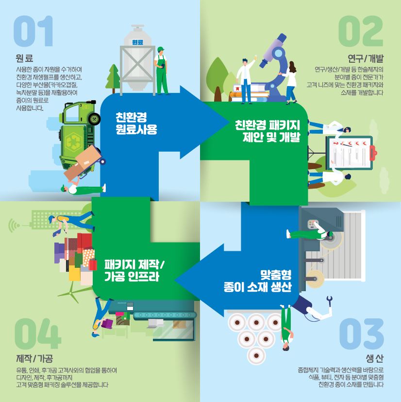 3단계는 연구결과에 따라 맞춤형 종이 소재를 '생산'하는 단계로 종합제지 기술력과 생산력을 바탕으로 식품, 뷰티, 전자 등 분야별 맞춤형 친환경 종이 소재를 만듭니다.