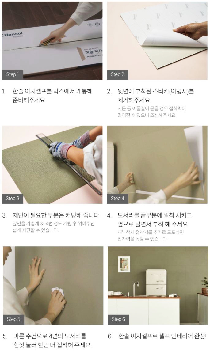 한솔이지셀프의 자세한 시공방법은 한솔홈데코 유튜브 채널에서 확인하실 수 있습니다.