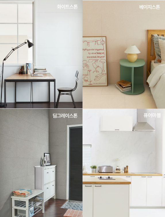 화이트스톤은 햇살처럼 눈부신 색으로 고요한 백사장을 연상시켜주고, 딤그레이스톤은 니스 해변의 자갈색에 스톤엠보의 적당한 무게감과 안정감이 더해져 고급스러운 분위기를 연출하기에 좋습니다. 베이지스톤은 공간에 차분하고 온화한 느낌을 선사하고, 퓨어마블은 부드럽고 맑은 대리석의 결을 그대로 살려 매력적인 공간을 연출합니다.