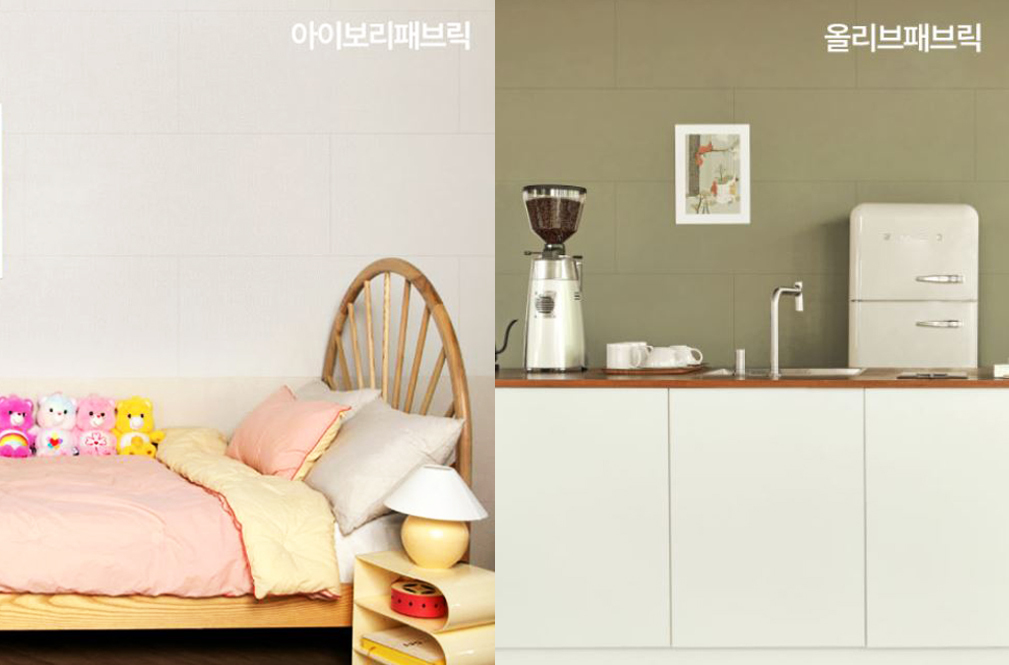 패브릭 패턴에는 아이보리패브릭과 올리브패브릭이 라인업 되어 있습니다. 아이보리패브릭은 순수한 아이보리 컬러에 패브릭 엠보 효과를 더해 깔끔하고 편안한 느낌으로 어디에나 잘 어울리며, 올리브패브릭은 지중해의 싱그러운 올리브 색을 연상시켜 공간의 여유과 품격을 높여줍니다.