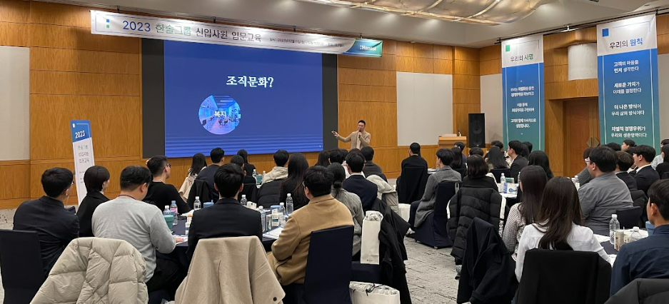 한솔그룹 신입사원 입문교육은 한솔그룹 일원으로 갖춰야 할 지식, 기술, 태도를 내재화하고, 아직 회사 생활이 익숙하지 않은 신입사원에게 한솔인으로서의 소속감과 자부심을 심어주는 시간입니다. 이 시간을 통해 그룹 공채 33기 신입사원들은 직장인의 마인드 셋을 강화하고 업무 수행에 필요한 기본 스킬을 다질 수 있게 되겠죠?