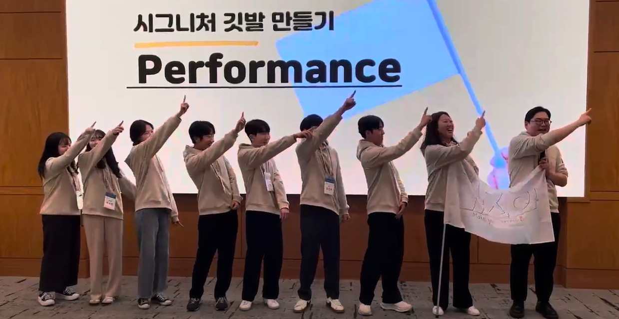 이어서 7조로 나뉘어 팀빌딩을 위한 팀명과 팀구호를 정하고, '시그니처 깃발 만들기'를 진행했는데요. 각 팀마다의 색깔과 개성이 느껴지는 발표도 곁들여졌습니다. 톡톡 튀는 아이디어와 재기발랄한 신입사원들을 보니, 한솔의 미래가 기대되네요~