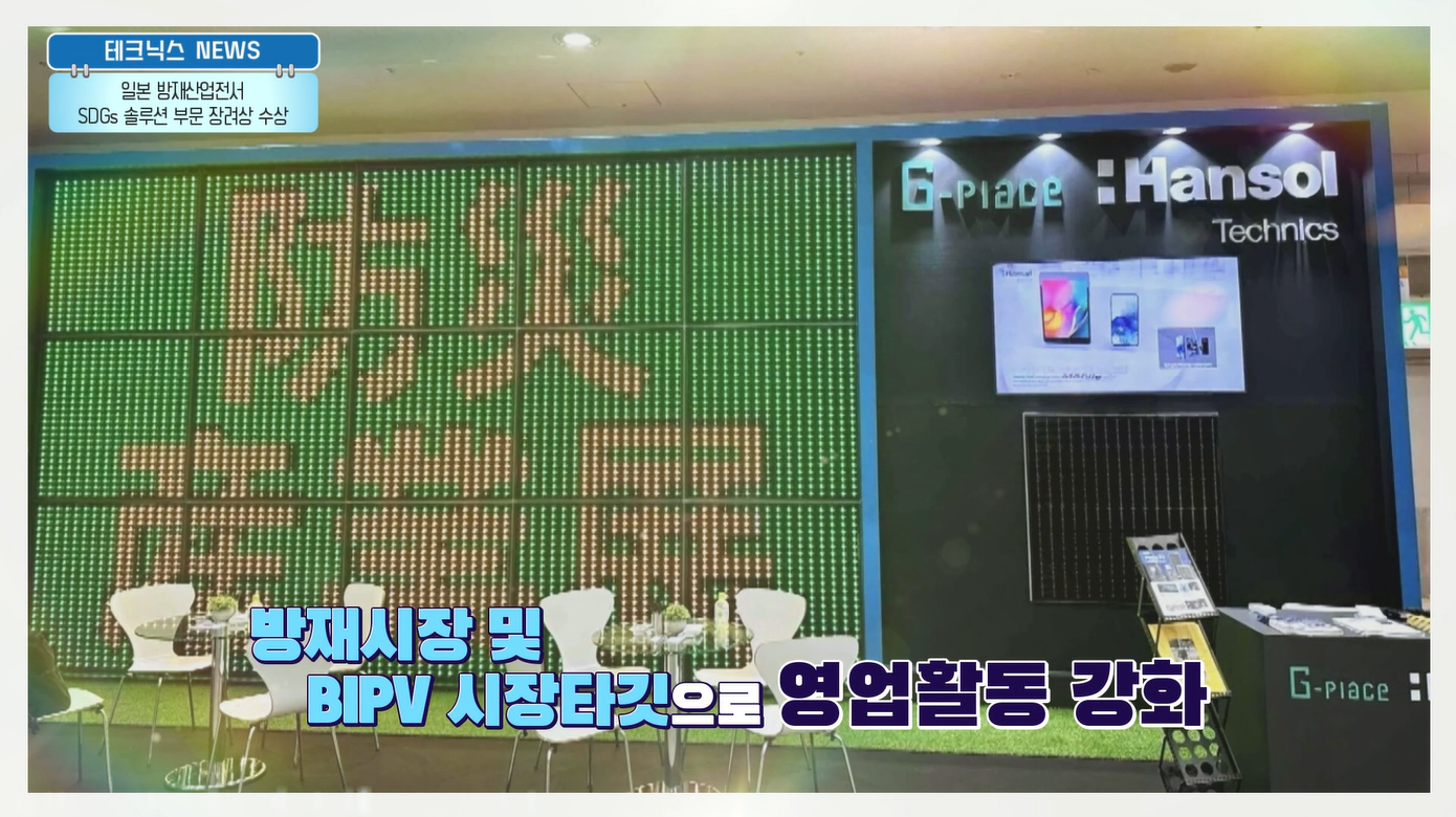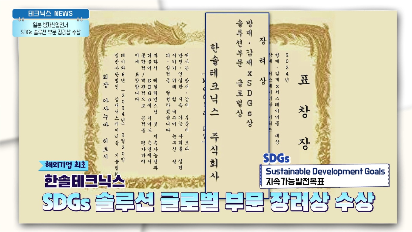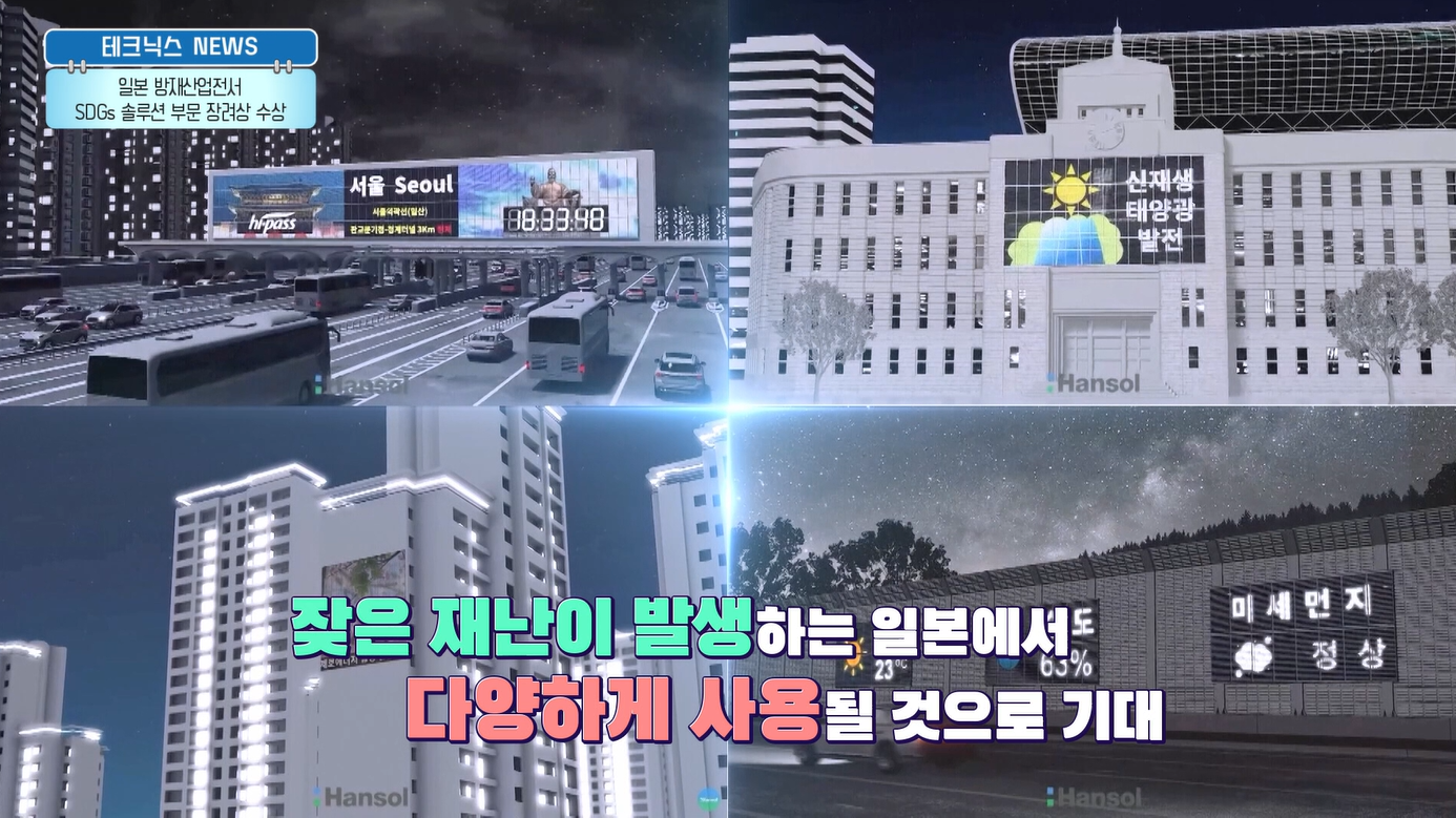 한솔테크닉스의 Media PV가 일본 도쿄에서 개최된 '방재산업전 2024' <방재・감재(減災) x 서스테이너블대상2024(防災・減災×サステナブル大賞2024)> 에서 해외 기업 최.초.로 SDGs 솔루션(Sustainable Development Goals, 지속가능발전목표) 글로벌 부문 장려상을 수상했습니다.