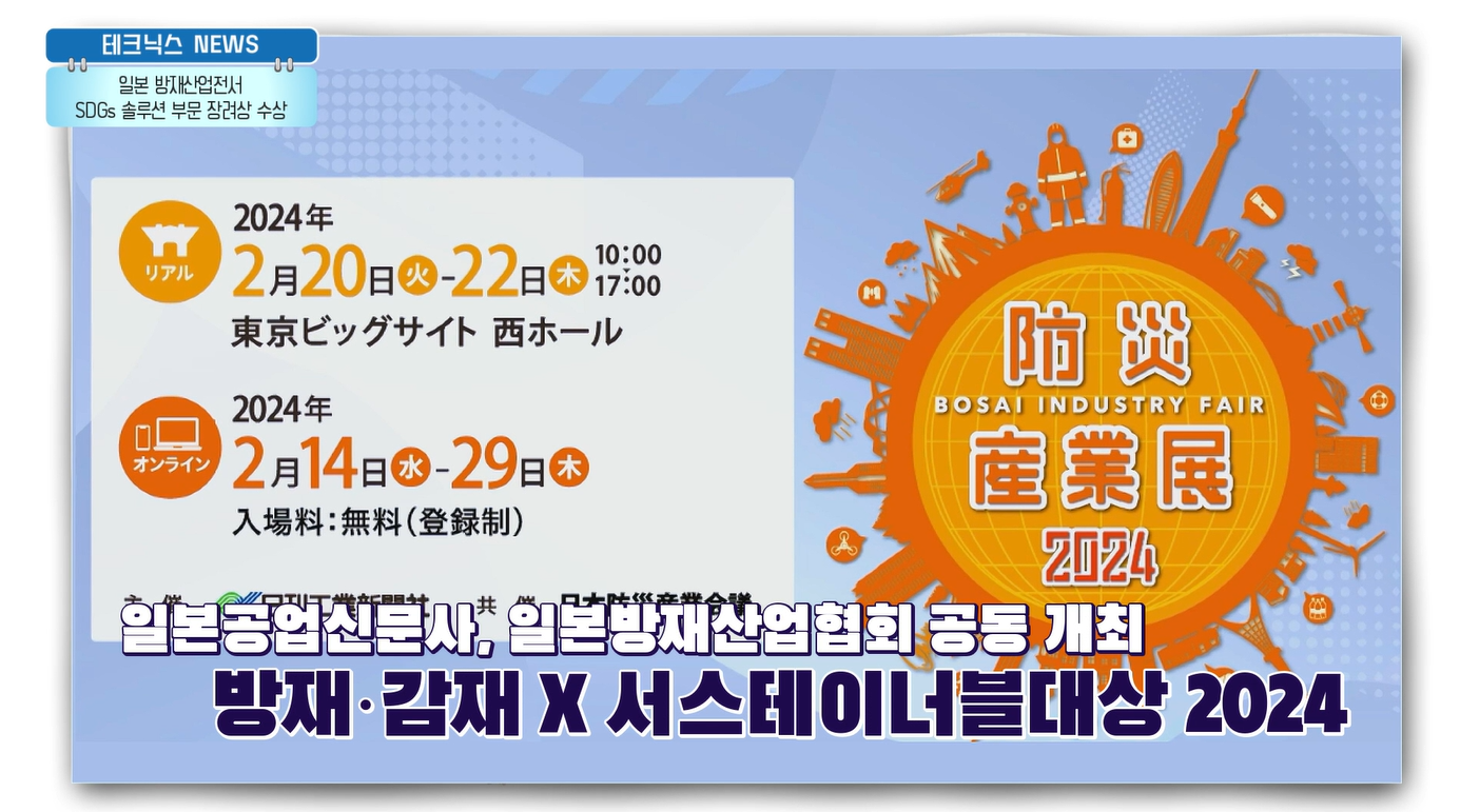 일본공업신문사와 일본방재산업협회가 공동으로 개최하는 '방재산업전 2024'는 일본 지역 내 대규모 재난 및 자연재해 등을 최소화하기 위한 목적으로 개최되고 있습니다. '방재・감재(減災) x 서스테이너블대상2024'에서는 재난 예방과 감소, 지속 가능한 사회 구축에 기여하는 제품, 기술, 서비스를 선정하여 시상하는데요. 2024년에는 7개 부문에서 수상작이 선정되었으며, 한솔테크닉스는 해외기업 최초로 SDGs 솔루션 글로벌 부문 장려상을 수상하는 좋은 성과를 거두었습니다.👏