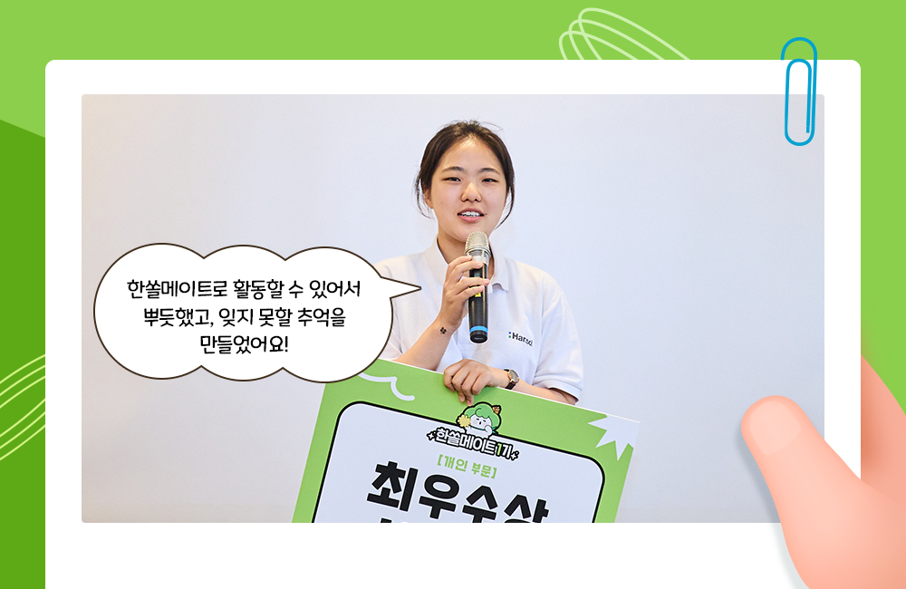 수상하신 분들 모두 축하드리고요. 아쉽게 수상 기회는 놓쳤지만 한쏠메이트 1기로 활동하며 다음 기수의 모범이 되어준 모든 한쏠메이트들 고생하셨습니다! 👏👏👏