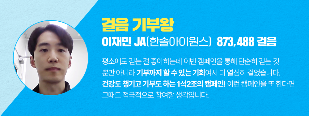 하루 평균 인당 5,752걸음, 목표 대비 245%라는 훈훈한 기록을 달성하며 ‘걸음기부 캠페인’을 성공적으로 마칠 수 있었습니다.