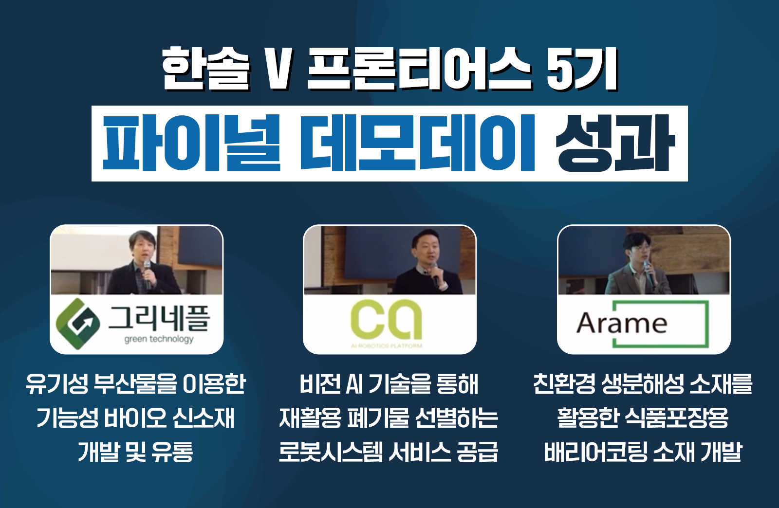 한솔 V 프론티어스 5기 데모데이에서는 6개 팀 모두 사업의 완성도가 높아진 것을 확인할 수 있었습니다. 특히 국내외 투자자가 참여한 만큼 투자 유치의 기회까지 이어졌는데요. 적극적인 지원을 통해 성장한 스타트업은 한솔그룹 계열사와의 협업을 통해 시너지 효과를 낼 것으로 기대합니다.