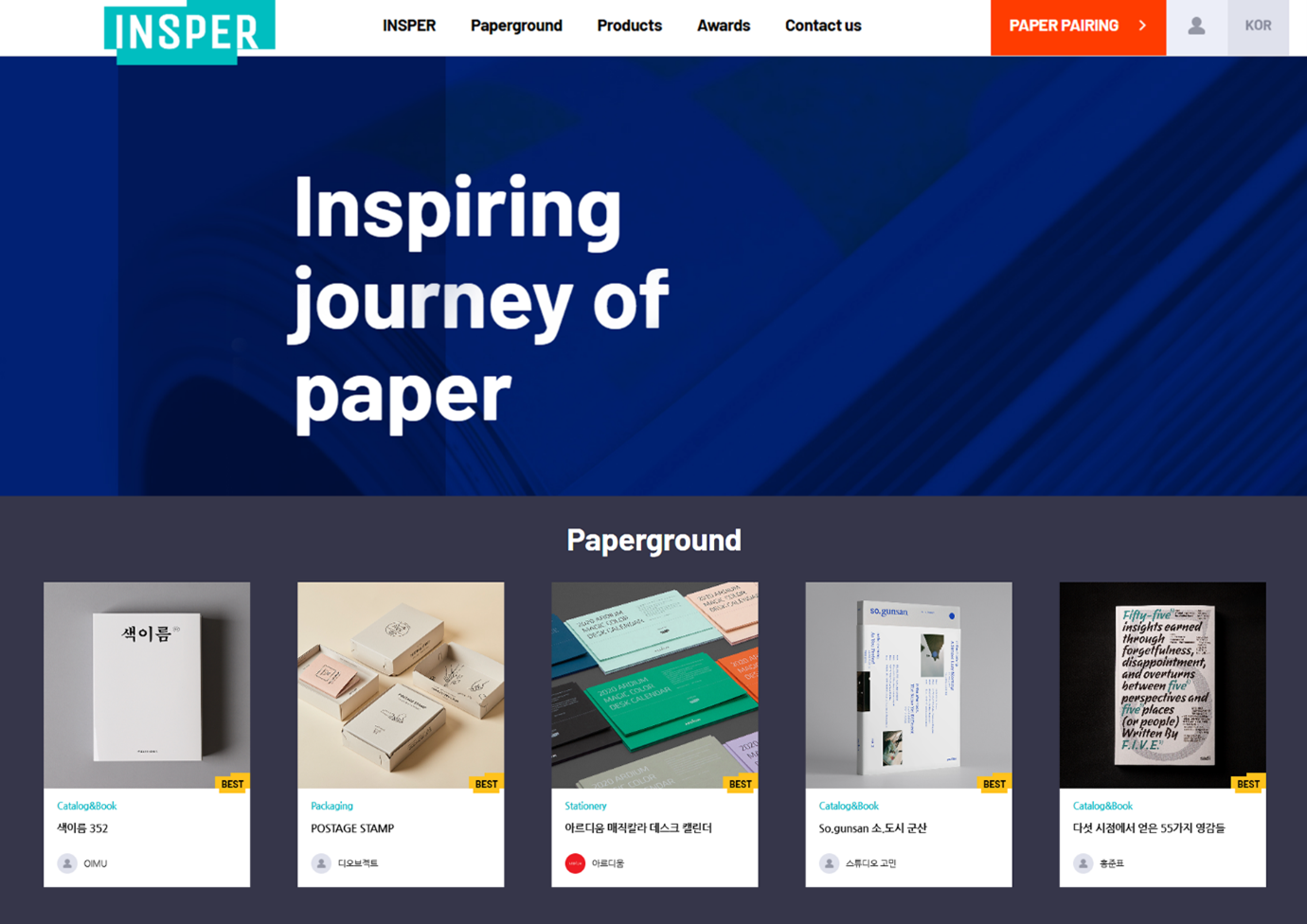인스퍼는 한솔제지 디자인 페이퍼 브랜드입니다. ‘Inspiring(영감)’과 ‘Paper(종이)’의 합성어로 영감을 불어넣는 종이라는 의미가 담겨 있는데요. 아이디어의 시작부터 작품의 완성까지 함께하며 탁월한 퍼포먼스를 낼 수 있도록 디자이너 곁에서 영감을 주는 종이가 되겠다는 의미를 담고 있습니다.
