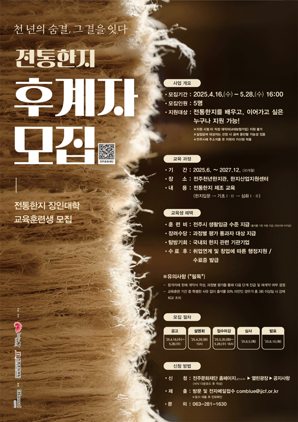 이번 '전통한지 장인대학'은 오는 2027년까지 운영되는 장기 교육과정으로, 입문∙기초∙심화 단계로 세분화되어 교육생의 역량에 맞춘 체계적인 커리큘럼이 제공됩니다. 특히 전주 지역의 한지장과 한지 전문가들이 직접 강의에 참여해 전통 기술을 깊이 있게 전수할 예정이며, 교육생으로 선정된 지원자들은 훈련기간 동안 ▲전주시 생활임금 수준의 교육훈련비 ▲각 과정별 통과자들에게 지급되는 장려 수당 ▲국내외 한지 관련 대학,기관,기업 탐방 기회 등을 제공받게 됩니다.