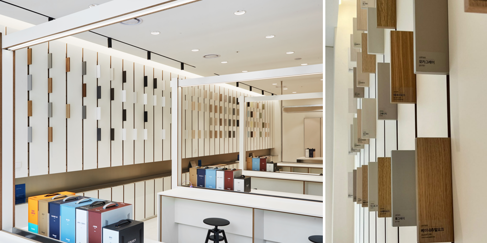 특히 공간 한 켠에 마련된 캐비닛에는 한솔홈데코 스토리보드(가구재)의 미니 샘플들이 꽂혀있는데요. 원하는 샘플을 직접 꺼내어 자재의 패턴과 색감을 자유롭게 확인해 볼 수 있고요. 주광색, 주백색, 전구색 등 다양한 조명의 따라 변화하는 색감의 차이도 확인할 수 있어 실제 주거공간에 적용되었을 때의 분위기를 생생하게 체험할 수 있습니다.
