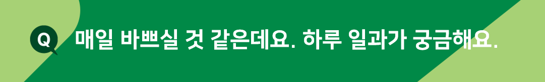 A. 저희 파트는 각자 2~3개의 한솔그룹 계열사를 담당하고 있기 때문에 하루가 정말 빠르게 지나갈 만큼 바쁜 일상을 보내고 있답니다.