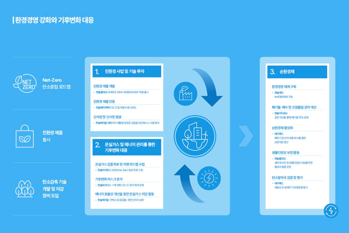 기후위기에 대한 경각심이 고조되고 있는 가운데 2050년까지 탄소중립을 달성하기 위한 국내외 기업의 움직임이 활발해졌는데요. 한솔그룹도 경영 활동으로 인한 부정적 환경영향을 최소화하고 글로벌 기후위기 해결에 기여하고자 온실가스 발생 최소화, 신재생에너지 전환, 친환경 기술 및 제품 개발 등을 위해 노력하고 있습니다.