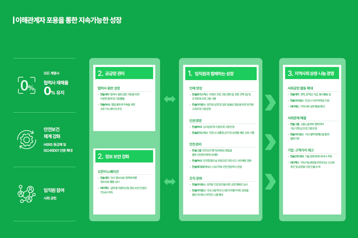한솔그룹은 임직원의 성장과 협력사의 동반성장, 지역사회와의 상생을 통해 지속가능한 사회적 가치를 창출하고자 합니다. 그룹 차원의 인재육성, 공급망 관리, 정보 보안, 지역사회 상생 등 전사적인 관리체계를 구축하고 있으며, 지역사회 문제해결과 사회공헌 활동 확대 등을 통해 사회적 책임을 다하고자 노력하고 있습니다.
