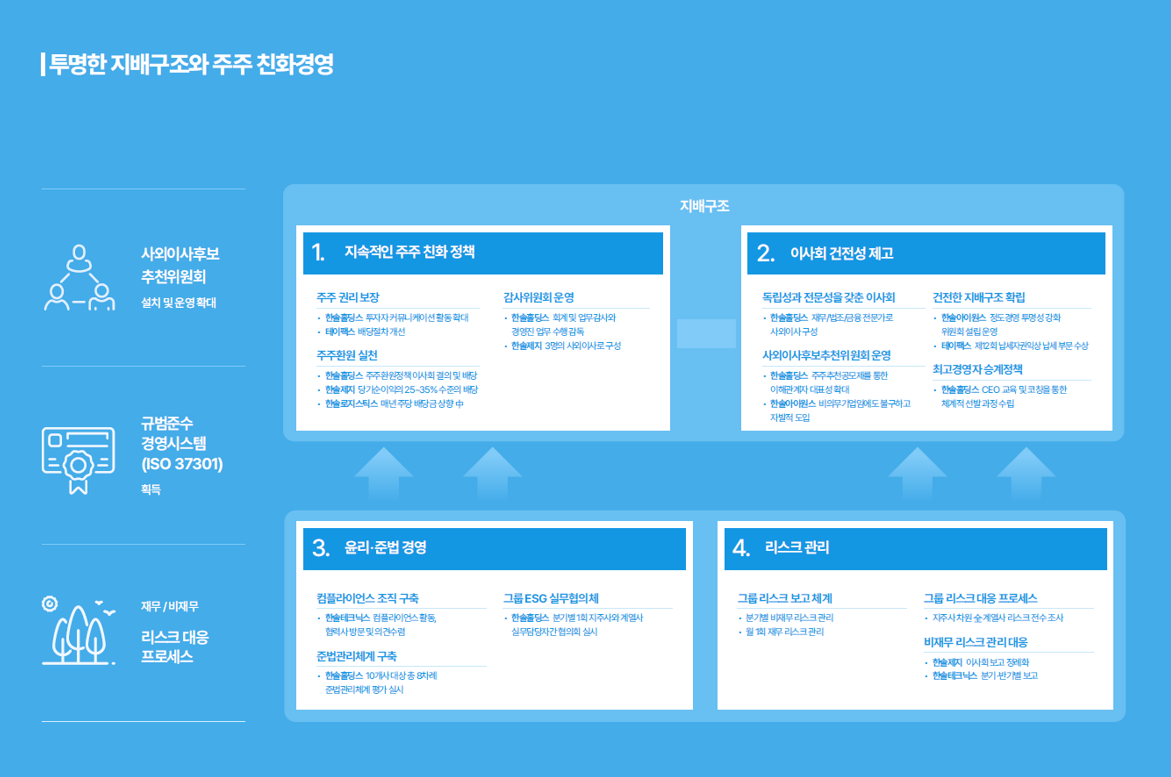 한솔그룹은 이사회 건전성 제고, 주주 친화 정책, 윤리준법 경영 체계, 리스크 관리 고도화를 통해 투명하고 지속가능한 거버넌스를 구축하고 있습니다. 사회이사후보추천위원회 확대 운영, ISO 37301(규범준수경영시스템) 인증 획득 등을 통해 이사회의 독립성과 전문성을 강화하고 있으며, CEO 승계정책 및 내부통제 시스템을 정비해 안정적인 경영체계를 마련하고 있습니다. 또한, 그룹 차원의 리스크 대응 프로세스를 수립하여 비재무 리스크까지 선제적으로 관리해나가고 있습니다.