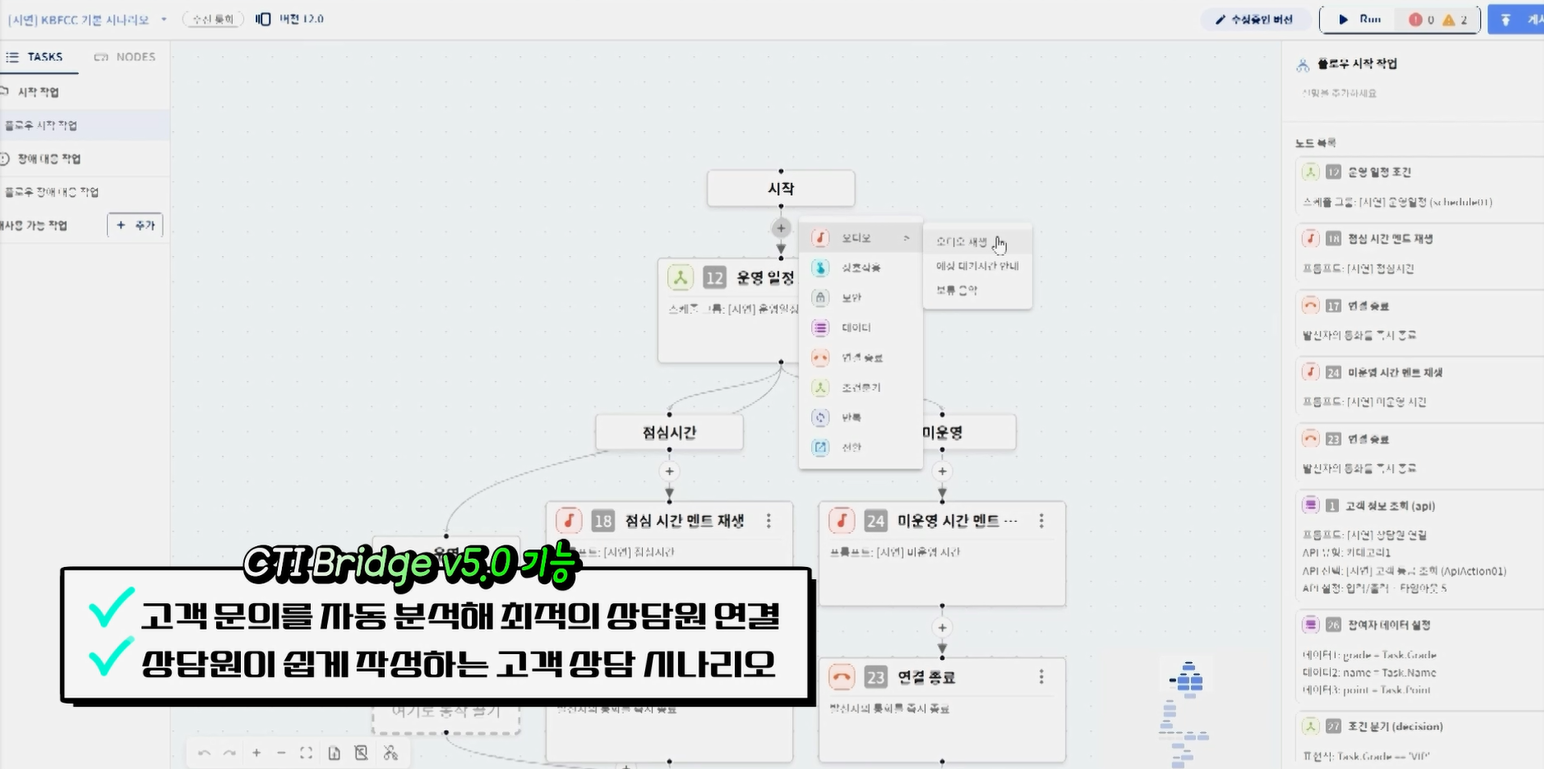 또한, CTI Bridge v5.0의 에디터 기능은 고객상담 시나리오를 누구나 쉽게 만들 수 있도록 지원하는 시각화 도구입니다. GUI (GraphicaI User Interface) 기반으로 설계되어 직관적인 화면에서 상담 흐름을 구성할 수 있어, 상담원은 고객 맞춤형 시나리오를 손쉽게 만들어 대응할 수 있습니다. 이를 통해 컨택센터는 변화하는 상황에도 빠르고 유연하게 대응할 수 있어 운영 민첩성을 크게 향상시킬 수 있으며, 상담 과정의 일관성과 품질을 쉽게 관리할 수 있다는 장점이 있습니다.