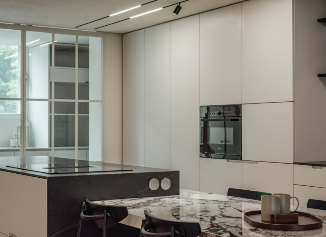 차분한 그레이 톤이 스톤의 질감을 더욱 돋보이게 하며, 주방·아일랜드·아트월 같은 공간을 더욱 특별하게 만들어줍니다.