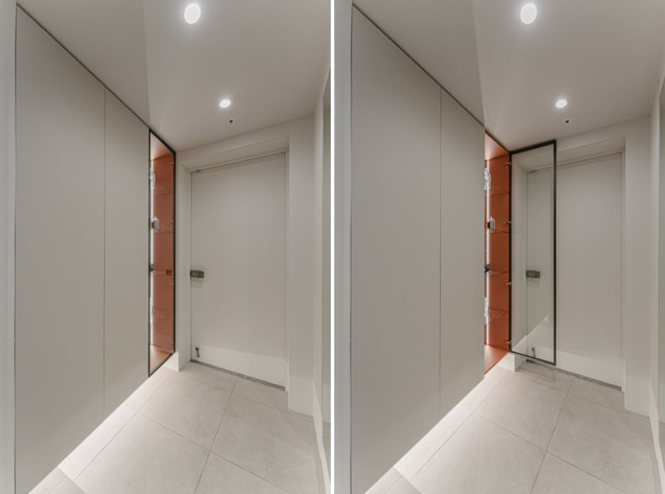 현관의 신발장 가구에도 포그그레이는 세련되게 잘 어울립니다.