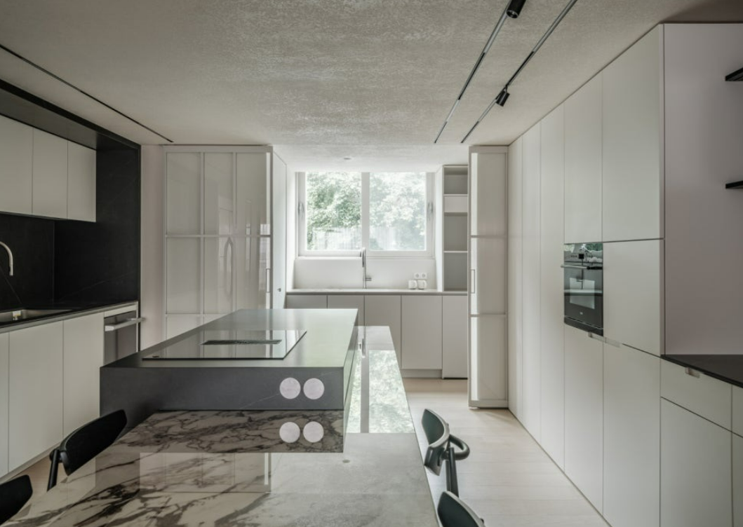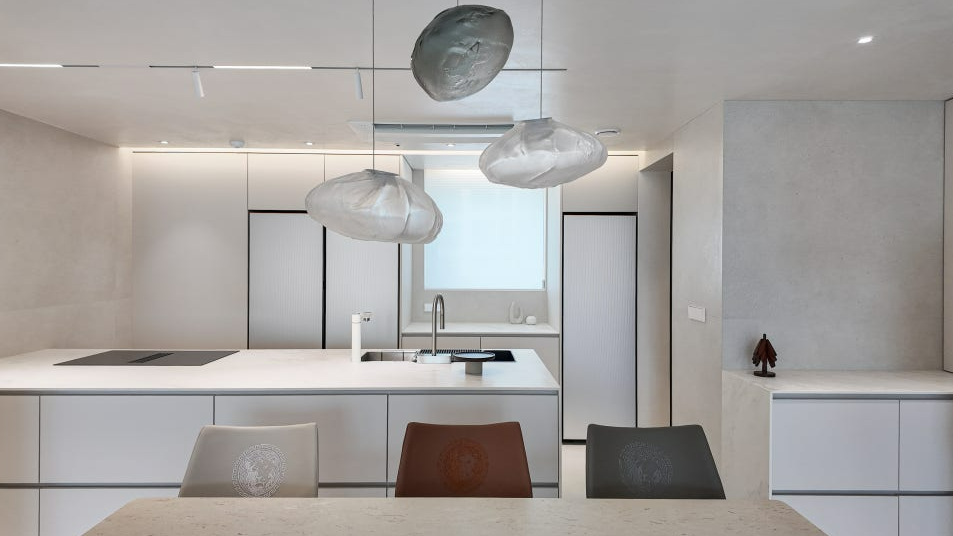 차분한 그레이 톤이 스톤의 질감을 더욱 돋보이게 하며, 주방·아일랜드·아트월 같은 공간을 더욱 특별하게 만들어줍니다.