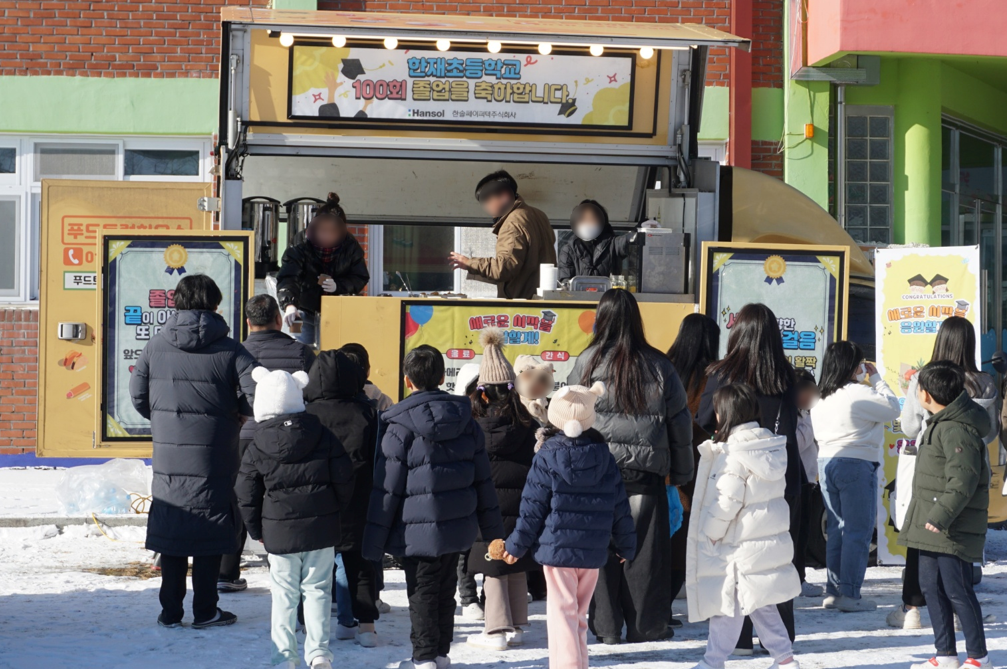 한솔페이퍼텍은 2013년부터 12년간 한재초등학교 졸업생을 대상으로 장학금을 꾸준히 지원해, 아이들의 새로운 출발을 응원해오고 있습니다. 특히 올해는 한재초등학교 100회 졸업식이라는 뜻깊은 날을 맞아, 장학금 지급과 함께 따뜻한 음료와 붕어빵 등을 제공하는 간식차도 함께 지원했습니다.