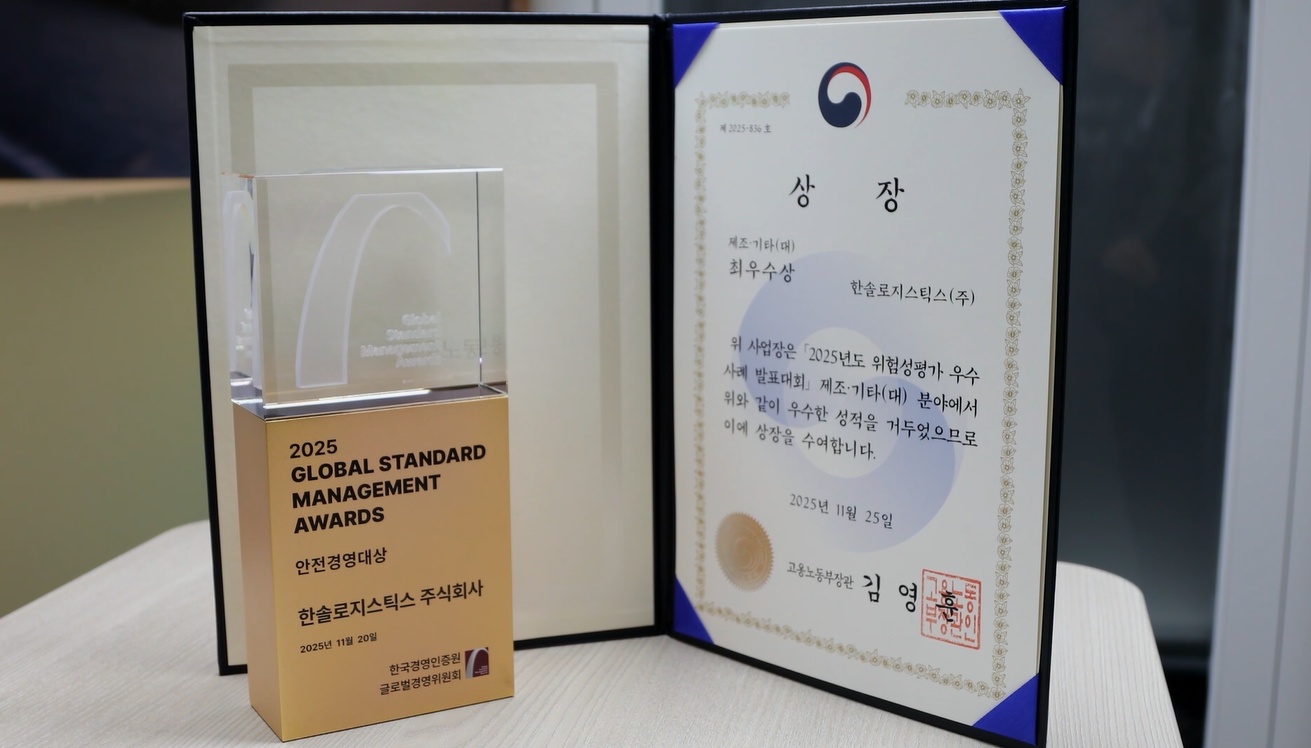 한솔로지스틱스는 제24회 글로벌스탠더드경영대상에서 ‘안전경영대상’을, 2025년 위험성평가 우수사례 발표대회에서 ‘최우수상’을 수상하며 안전보건경영 역량을 대외적으로 인정받았습니다.