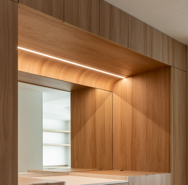 거울 상단에는 베이내츄럴오크를 곡면으로 가공해 적용한 구성이 보이는데요. 라인 조명이 위에서 비출 때 얼굴에 그림자가 생기지 않도록 빛의 방향을 약 45도 각도로 설계한 공간입니다.