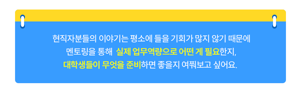 1차 정기모임은 아마 한쏠메이트이 가장 좋았던 활동 중 하나로 꼽을 거예요. 다양한 분야에서 커리어를 수행하고 있는 한솔그룹 임직원들의 멘토링 시간이었거든요. 마케팅, ESG, PR, 전략기획까지! 한쏠메이트가 희망하는 다양한 직군의 멘토님들이 모여 진로상담을 해주었답니다.