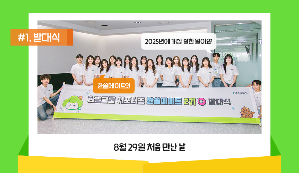 한솔그룹 역사상 처음 탄생한 서포터즈 1기가 열심히 땅을 디디고 고른 자리에 지난해 스무 개의 새로운 싹이 돋아났습니다. 수줍지만 열정적이고, 유연하지만 강한 의지로 한솔그룹과 함께 성장하고자 한솔그룹 서포터즈에 지원한 한쏠메이트 2기의 시작이었죠.