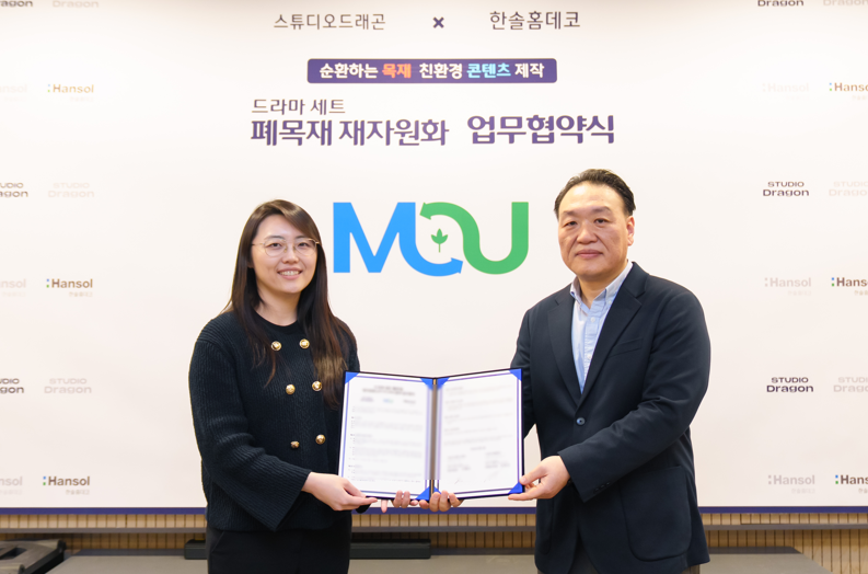 지난 1월 15일, 한솔홈데코가 스튜디오드래곤과 손잡고 '드라마 세트 폐목재 재자원화 및 친환경 순환체제 구축'을 위한 업무협약을 체결했습니다.