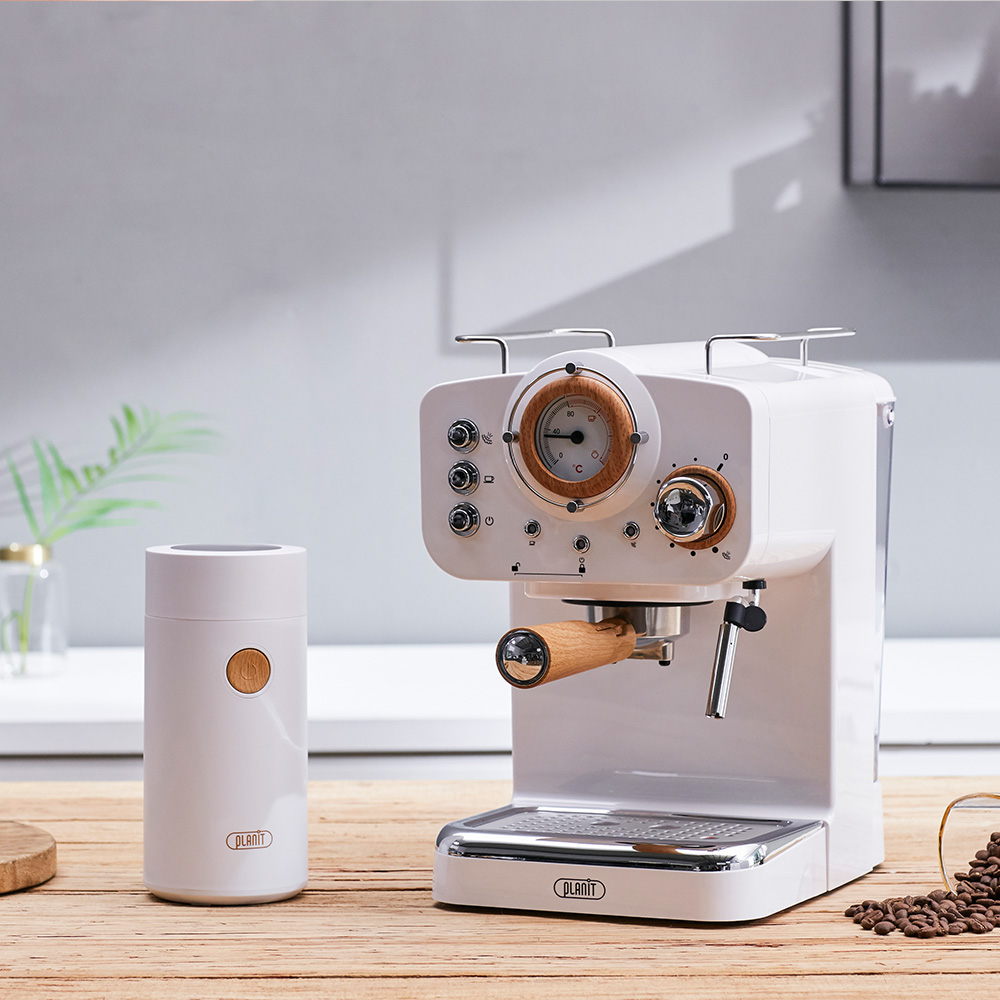 첫 번째 후보는 바로 “플랜잇 노르딕 홈카페프레소”입니다. 플랜잇은 영국의 쿡웨어와 가정용품 제조사로 유럽과 미국의 음식물 안전성 규제 테스트에 모두 합격하여 친환경적이고 인체에 무해한 제품들로 잘 알려져 있습니다. 커피머신에는 캡슐을 이용해 커피를 내리는 캡슐머신과 원두에서 직접 커피를 추출하는 원두머신이 있죠. 플랜잇의 노르딕 홈카페프레소는 원두머신에 해당하여, 원하는 원두를 골라서 내 취향에 맞게 커피를 내려 마실 수 있다는 장점을 가지고 있습니다. 플랜잇에서는 원두 그라인더도 함께 판매하고 있는데요. 그라인더를 구매하면 직접 원두를 갈아 내려 마시는 재미까지 즐길 수 있겠습니다. 또한, “플랜잇 노르딕 홈카페프레소”는 예쁜 디자인으로도 유명한데요. 기계에 우드 포인트가 들어가 있어 빈티지 분위기를 연출하기에 제격입니다. 나만의 빈티지 홈 카페를 꾸미고 싶으시다면 플랜잇의 제품을 구매하시면 좋겠습니다.