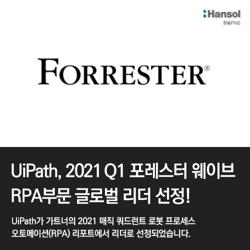 한솔가족인 한솔PNS와 협력하고 있는 글로벌 RPA 기업 유아이패스(UiPath)가 포레스터 리서치가 발표한 ‘2021년 1분기 포레스터 웨이브: 로보틱 프로세스 오토메이션 (RPA)’ 보고서에서 리더로 선정됐다고 밝혔습니다.