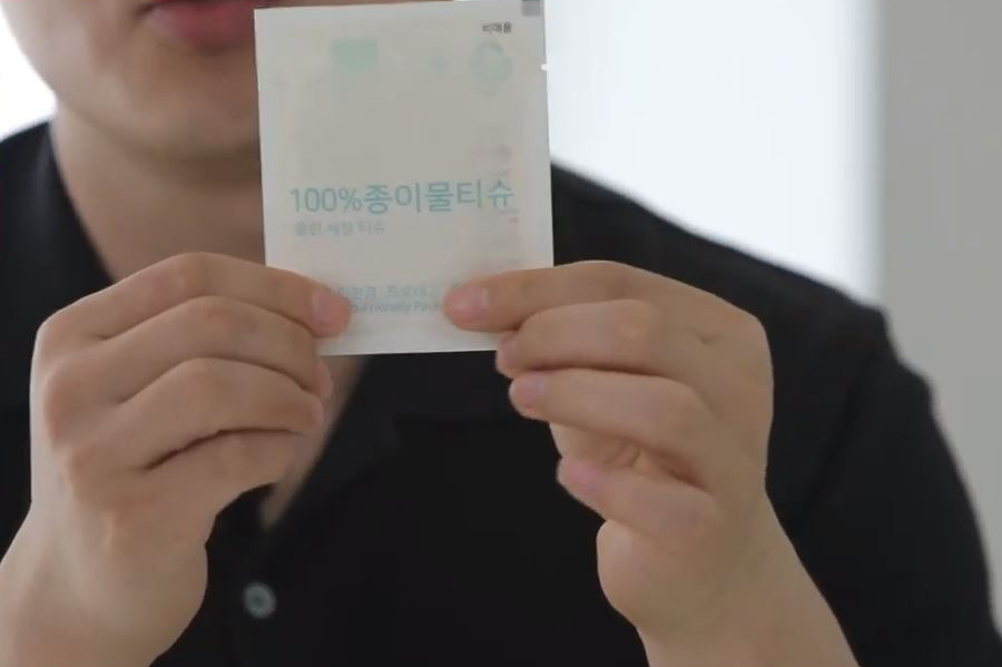 일반적으로 물티슈는 천연 펄프 레이온과 폴리에스테르 혼방의 부직포 원단으로 만들어집니다. 역시 플라스틱이 포함되어 있는 것입니다. 이디야커피 매장 내 종이 물티슈는 프로테고 소재입니다.