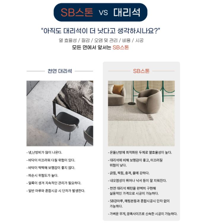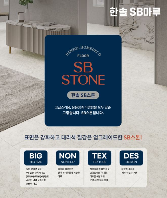 또한 한솔SB스톤마루는 천연대리석이나 폴리싱 타일의 깨짐, 딱딱함, 차가움, 미끄러움 등의 단점을 보완