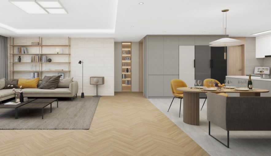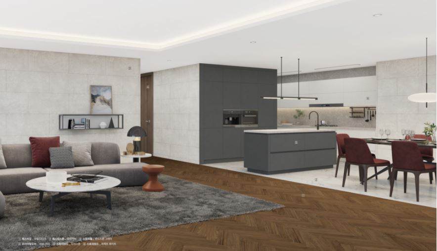 거실에 시공된 에스비강 스칸디나비안 엘름은 헤링본으로 시공되어 공간에 생기를 불어넣어주며,