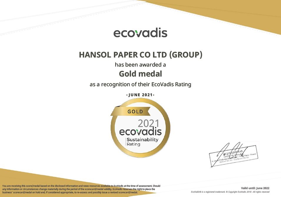 한솔제지가 ‘에코바디스(EcoVadis)’가 실시하는 글로벌 기업 지속가능성 평가에서 2년 연속 ‘골드(Gold)’ 등급을 획득했습니다. 세계 160여 국가, 200여 산업, 7만 5000개 이상 기업을 대상으로 환경과 인권, 윤리, 지속가능성 등 4개 분야를 평가해 상위 5% 기업만이 골드 등급을 받습니다.