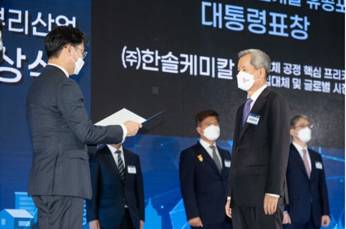 2021년 10월 13일 산업통상자원부가 개최한 '2021 소부장뿌리기술대전' 개막식에서 한솔케미칼이 대통령 표창을 수상하는 영예를 안았습니다.