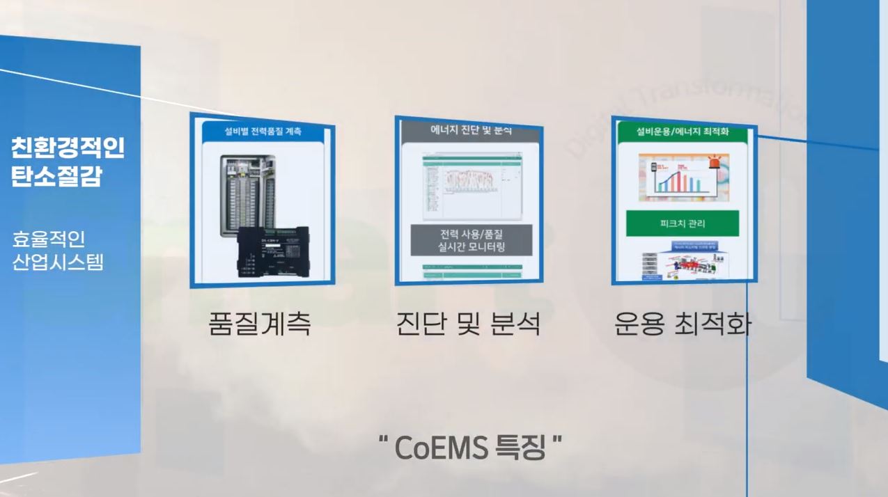 에너지자동화솔루션 CoEMS는 친환경적인 탄소절감 품질계측, 진단 및 분석, 운용 최적화 프로세스를 활용해 공장 설비 및 공장 전체의 에너지 및 탄소를 절감하여 공장효율을 극대화하도록 설계되었습니다.