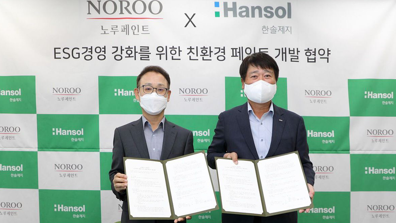 한솔제지가 노루페인트와 손잡고 친환경 페인트 개발을 추진합니다. 한솔제지와 노루페인트는 2021년 11월 ‘ESG(환경·사회·지배구조)경영 강화를 위한 친환경 페인트 개발 협약’을 체결하고 한솔제지가 개발한 친환경 신소재 나노셀룰로오스 ‘듀라클(Duracle)’을 활용해 페인트에 적용할 수 있는 친환경 첨가제를 개발, 생산할 계획입니다. 양사는 자연과 인간이 함께 지속할 수 있는 환경을 만들기 위해 긴밀한 협조를 이어갈 것입니다.