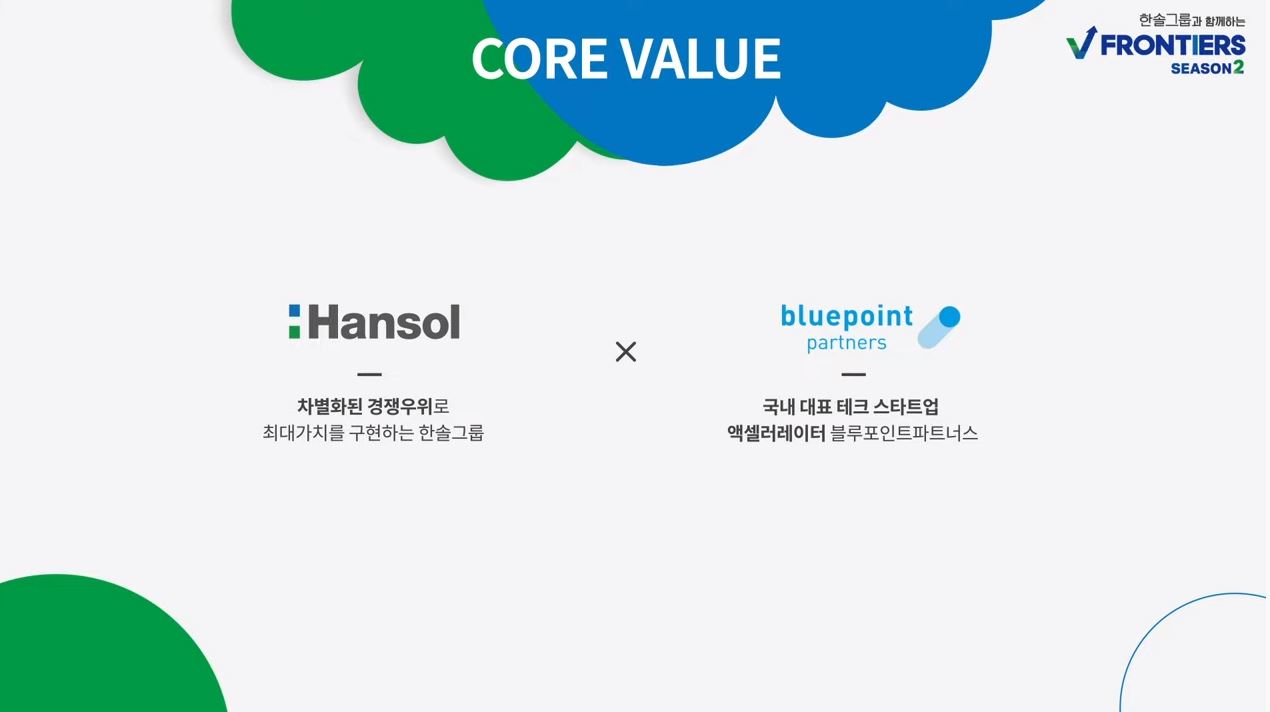 한솔 V 프론티어스는 한솔그룹과 기술 창업 전문 블루포인트파트너스가 연계하여 기술 기반의 유망 스타트업 또는 예비창업자를 지원하는 스타트업 액셀러레이팅 프로그램입니다. 4차 산업 분야 혁신 기술을 보유하고 있는 스타트업을 선발해 성장을 돕고 산업 생태계 활성화를 도모한다는 취지로 기획되었습니다.