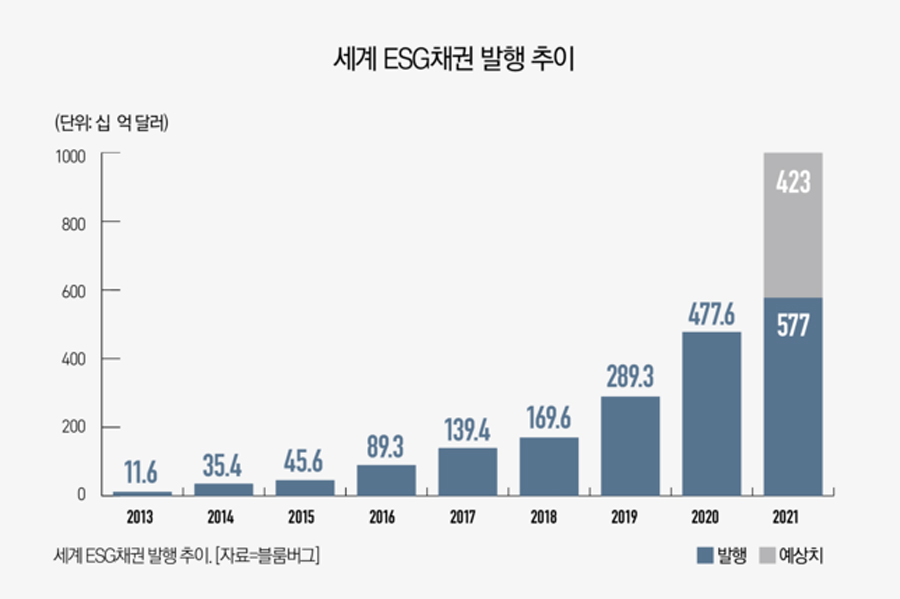 비재무적 요소가 기업가치에 미치는 영향이 커지면서 기업들은 발 빠르게 환경과 관련된 사업 확장에 나서고 있고, 이와 관련된 사업자금 조달 수단으로 ESG채권을 발행하고 있는 것입니다. 전 세계 ESG채권 발행액은 지난해 1조 달러를 넘겨 2년 새 3배 이상 가파르게 성장했습니다.