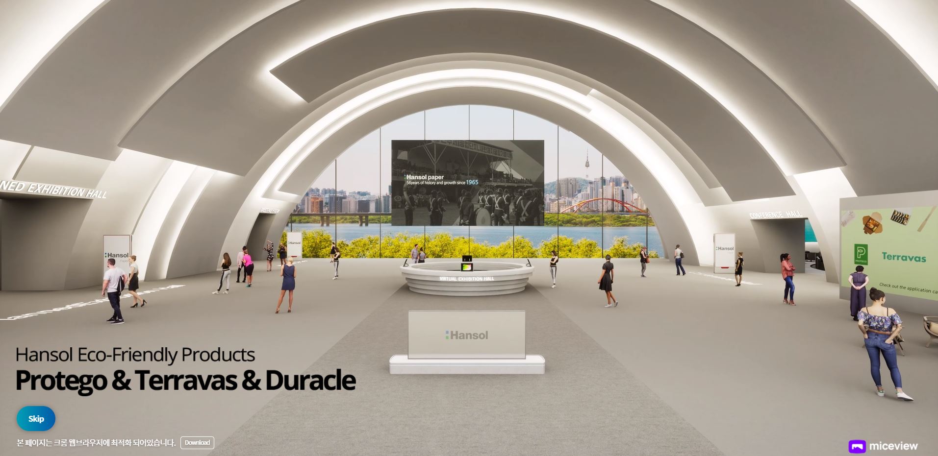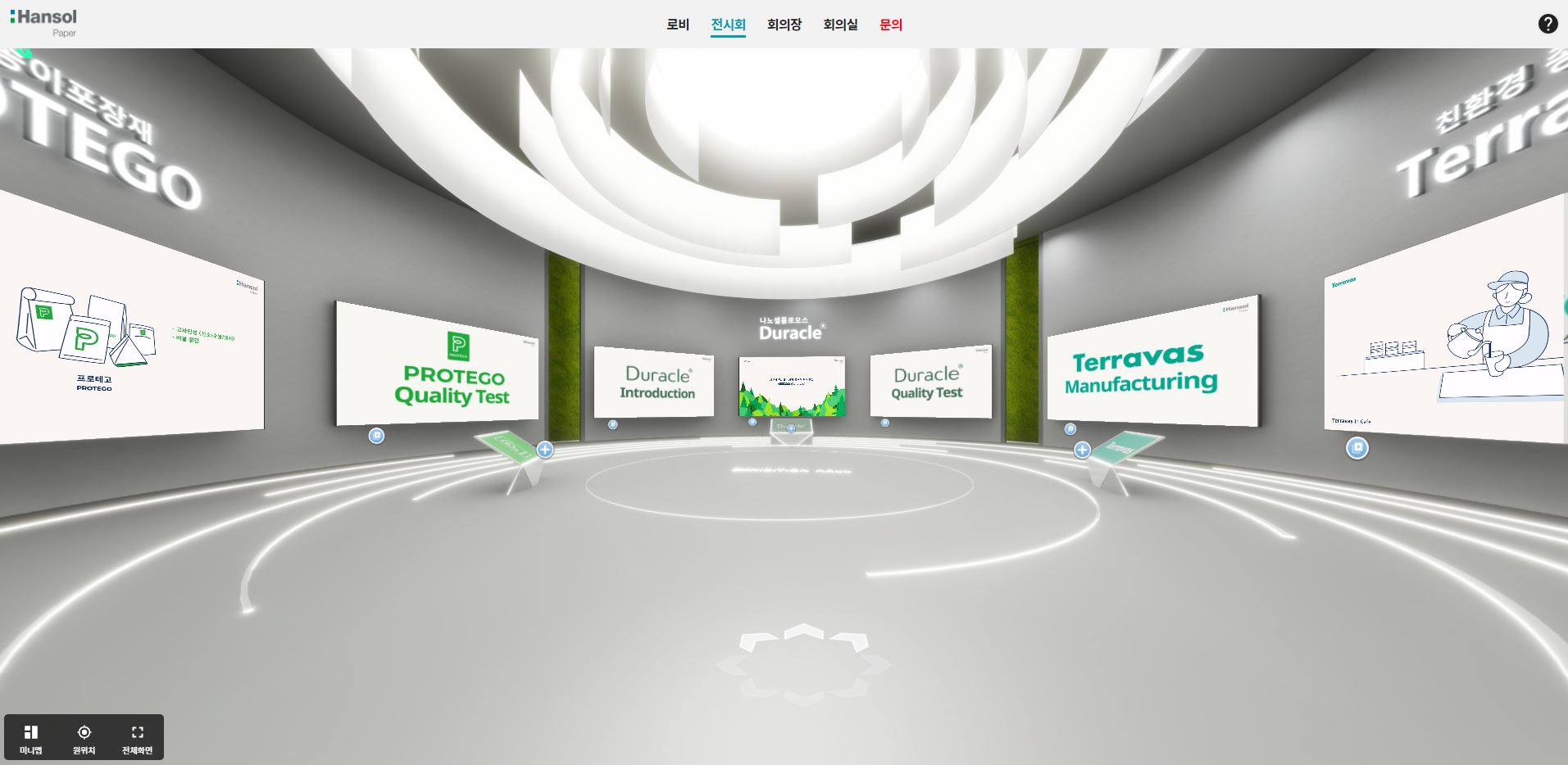 친환경 종이 포장재 ‘프로테고(Protego)’, 자연을 담은 용기 ‘테라바스(Terravas)’, 생분해성 소재 ‘듀라클(Duracle)’과 한솔제지에 대해 현실감 있게 소개합니다. 한솔제지 메타버스 가상전시관은 크게 ‘로비, 전시회, 회의장, 회의실, 문의’의 5가지 메뉴로 구성, 공정과정과 제품의 특징, 포트폴리오 등을 상세하게 확인할 수 있습니다.