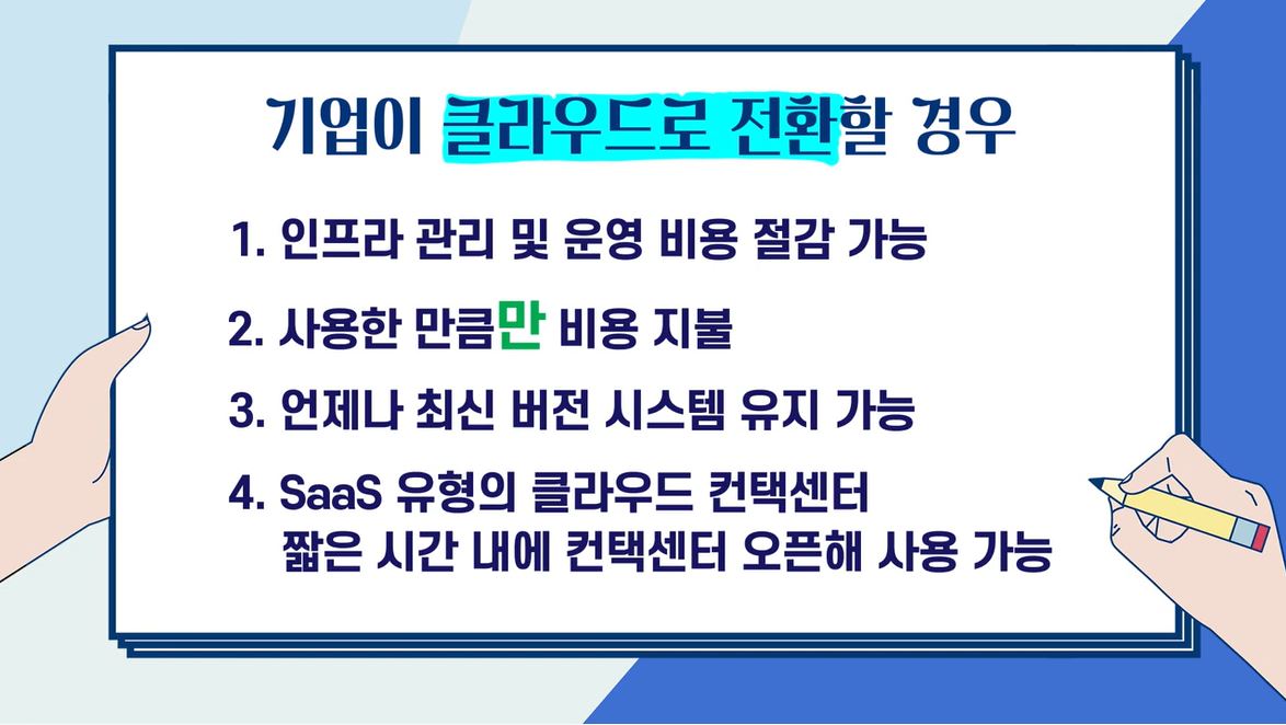 몇 년 전부터 높은 초기 구매 비용 부담을 원치 않는 국내 중소형 컨택센터들이 클라우드 컨택센터로 빠르게 전환되고 있습니다. 클라우드 컨택센터는 IaaS형과 SaaS형이 주로 선택됩니다.