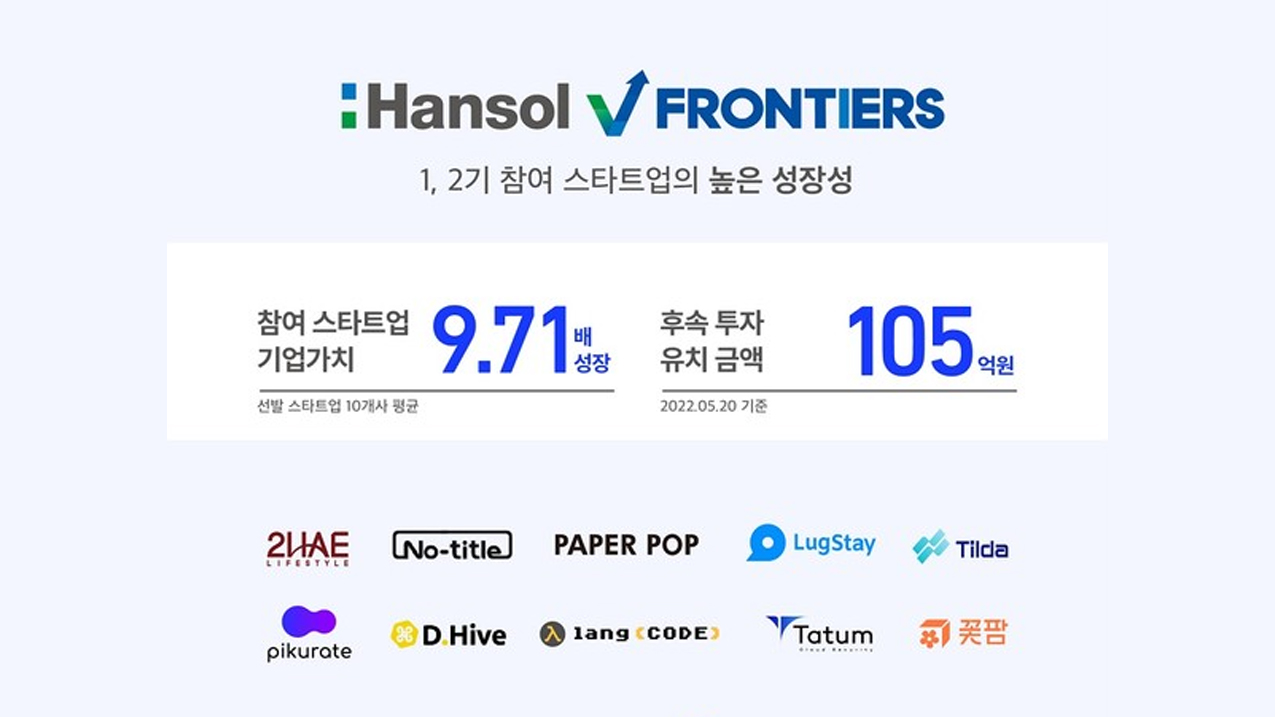 한솔그룹과 블루포인트파트너스가 육성한 스타트업들이 높은 성장성을 보이고 있습니다. 오픈이노베이션(개방형 혁신) 프로그램 ‘한솔 V 프론티어스’의 1, 2기 참여 10개 스타트업들의 기업가치는 79.8억원으로 선발 이전에 비해 평균 9.7배 증가했습니다. 후속 투자유치 금액도 105억 원에 이릅니다.