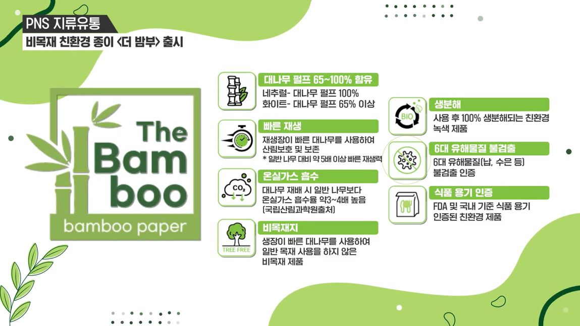 한솔PNS 지류유통 부문이 대나무 펄프로 만든 비목제 친환경 종이 ‘더 밤부’를 새롭게 출시했습니다. 더 밤부는 사용 후 100% 생분해되는 친환경 녹색 제품으로 네추럴 컬러는 대나무 펄프 100%로 만들어졌으며 화이트 컬러는 65% 이상을 함유하고 있습니다.
