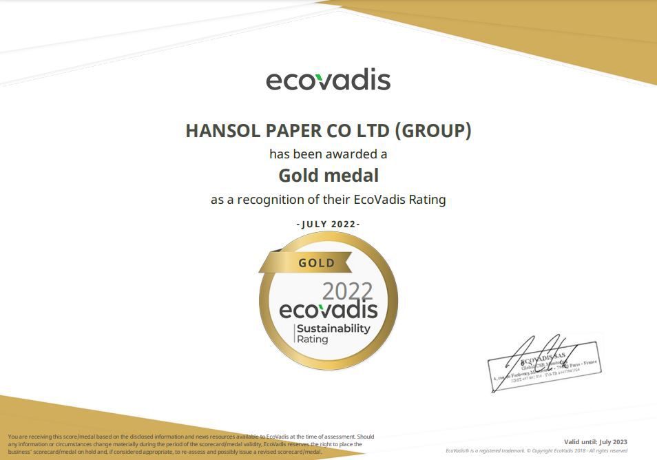 한솔제지는 글로벌 조사기관 에코바디스(EcoVadis)의 ‘2022 지속가능성 평가’에서 3년 연속 골드(Gold) 등급을 획득했습니다. 골드 등급은 ESG경영 상위 5% 이내 기업에만 부여됩니다. 특히 환경 부문에서 우수한 점수를 기록했으며, 지속 가능한 조달 부문에서도 전년 대비 대폭 개선된 점수를 받아 평가 기업 중 상위 3%에 선정되었습니다. 이는 한솔제지의 ESG경영 성과가 세계적 기업들과 비교해도 매우 높은 수준임을 인정받은 것으로 그 의미가 남다르다고 할 수 있습니다.