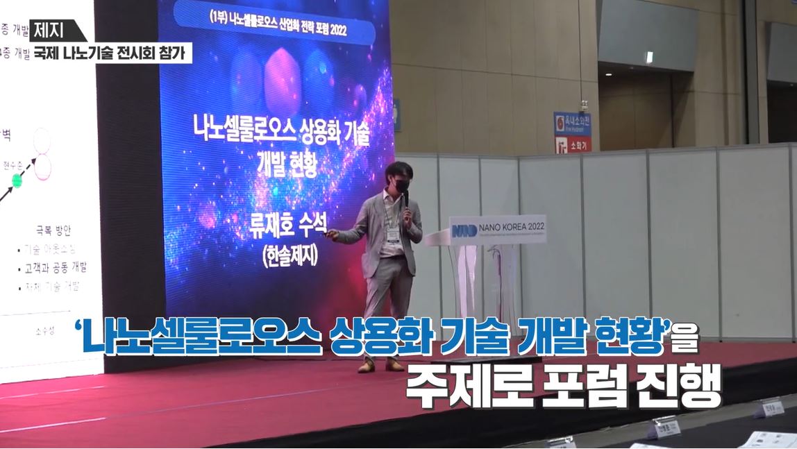 한솔제지는 2022년 나노코리아 박람회에서 나노셀룰로오스를 활용한 친환경 신소재 듀라클(Duracle)과 리그넘社의 바이오필러 SSEIF 기술을 선보였습니다. 듀라클은 지구상에 가장 널리 존재하는 펄프를 나노 사이즈로 제조한 것으로 무게가 철의 5분의 1에 불과하지만, 강도는 5배 더 높아 철·플라스틱 등의 대체재로 꼽힙니다.