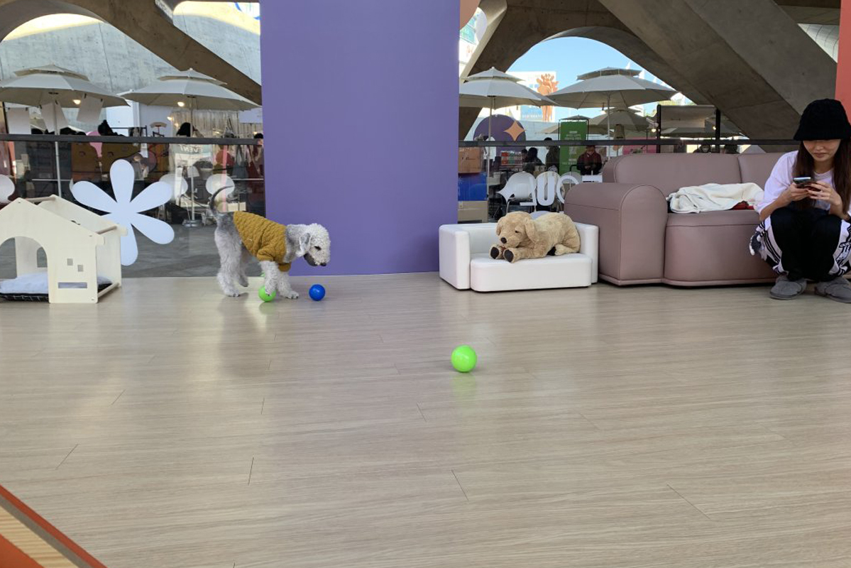 DDP 어울림 광장에 조성되어 있는 '펫빌리지'에서는 한솔홈데코의 반려동물 맞춤 마루 제품인 '한솔펫마루'를 체험할 수 있습니다. 펫빌리지는 반려동물과 동반 입장이 가능한 무료 체험관입니다. 반려동물들과 함께 행사를 즐길 수 있도록 반려동물이 마음껏 뛰어놀 수 있는 잔디가 넓게 깔려 있습니다.