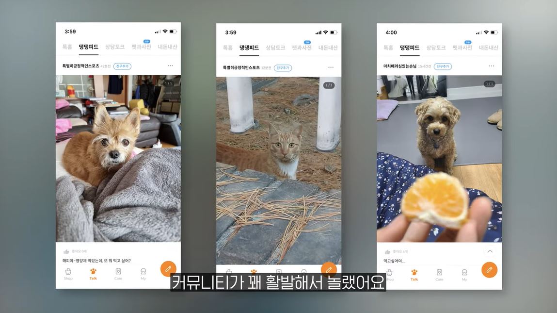 반려동물이 너무 귀여워 사진만 봐도 행복한 반려인들을 위해 페디즈 앱에는 사진을 공유하는 메뉴가 있습니다. 강아지 사진은 ‘댕댕피드’에 고양이 사진은 ‘냥냥피드’에 따로 올립니다. 그리고 자유롭게 일상의 이야기를 나누는 ‘댕댕톡톡’과 ‘냥냥톡톡’이 있습니다.