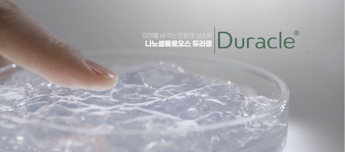 듀라클은 목재에서 유래한 천연 물질인 셀룰로오스를 10억 분의 1미터의 나노사이즈 섬유로 제조한 친환경 신소재로 다양한 산업에 적용되어 화학류의 첨가제를 대체할 수 있습니다. ‘제2의 탄소섬유’로 불릴 만큼 활용도가 높고, 나무에서 얻는 만큼 재생이 가능한 게 특징입니다.