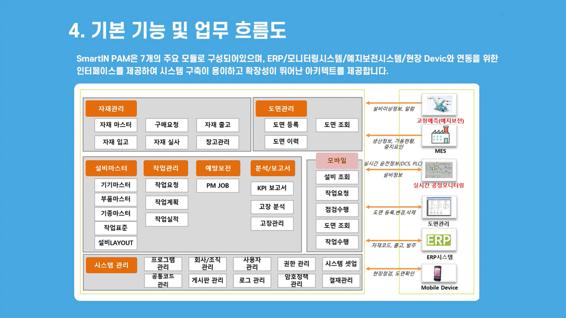 SmartIN PAM 플랫폼은 스마트팩토리와 디지털 트랜스포메이션에 꼭 필요한 솔루션으로 HTML5 표준 Web 기술 기반에 설비마스터, 작업관리, 예방보전, 자재관리, 분석/보고서, 도면관리, 시스템관리의 7가지 핵심 기능으로 구성되어 있습니다.